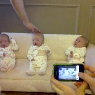 Triplet baby girls sit in matching outfits and matching pink chairs watching a movie in a play room. The person behind the camera pans across the babies and lands on one with wide eyes and a funny expression.