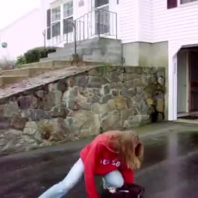 A woman laughs to hard she starts wheezing while watching a man try to keep his balance on an icy driveway then slips and falls onto his back.