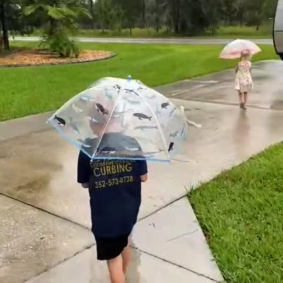 A young boy gets swung and flung onto the yard, as he tries to exit a front porch door. Security footage.