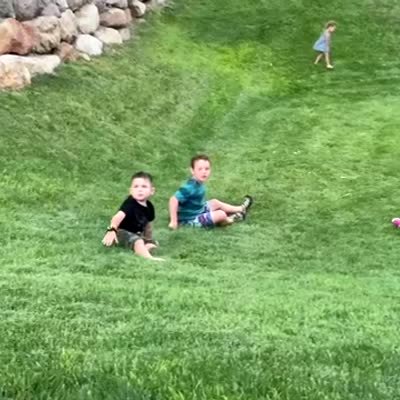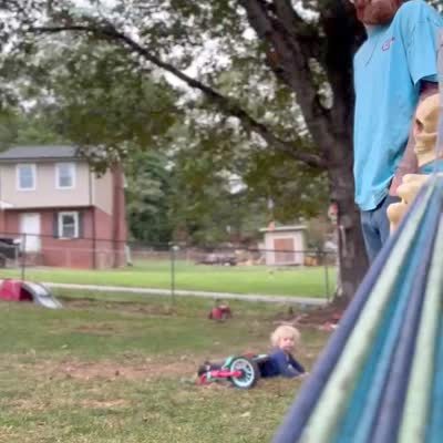 A dad tries to control his laughter, as his two boys race across a yard on their balance bicycles but the younger one topples forward and face-plants.