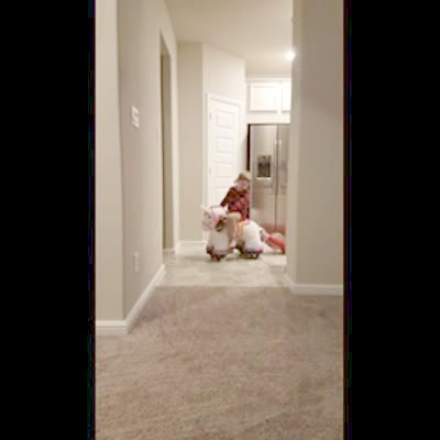 A young boy drives a toy unicorn through a kitchen while his sister holds the unicorn's tail and drags behind it.