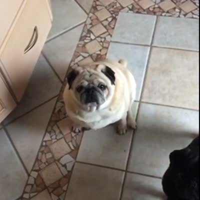 Two dogs butt heads in slow motion when their owner tosses a treat to them in the kitchen indoors. Vine/Instagram AA: dogs in super slo-mo