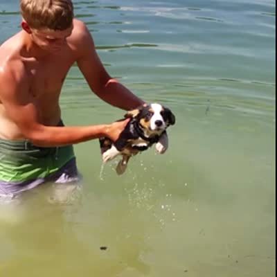 A puppy dog swims in water outdoors when a teen boy picks him up and he continues to paddle with his paws. Vine/Instagram.