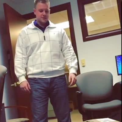 A man jumps when he sits on his desk and it sets off an air-horn. He examines his chair, then sits back down and the air-horn goes off again. Vine/instagram. Practical joke.