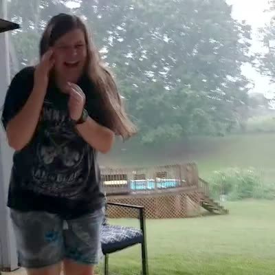 "Raccoon Acts Like a Goon" A raccoon walks up the front porch. A woman walks out and shoos it away. The raccoon comes back and chases the woman inside.