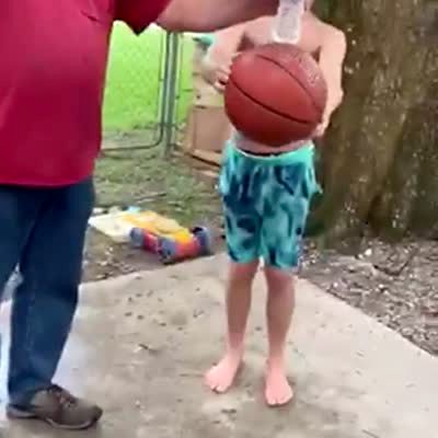A young boy does the Bottle Bounce Challenge but the bottle hits him in the groin.