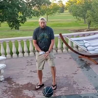A man takes a sip of beer while balancing the can on the basketball. Then he does the Bottle Bounce Challenge with the can but it bounces into his groin.