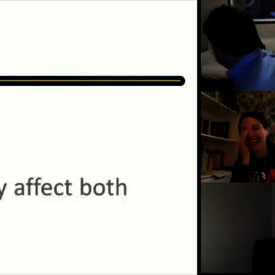 A woman struggles with her wireless connection and her students talk to each other through the Google Meet video call. One girl says they should behave because the video is being recorded, and another girl says "we'll be toast" then the girl says she wants toast for breakfast.