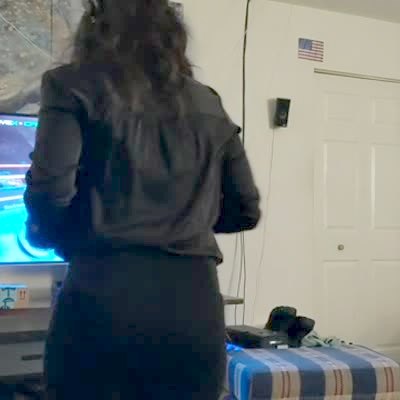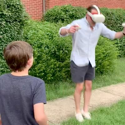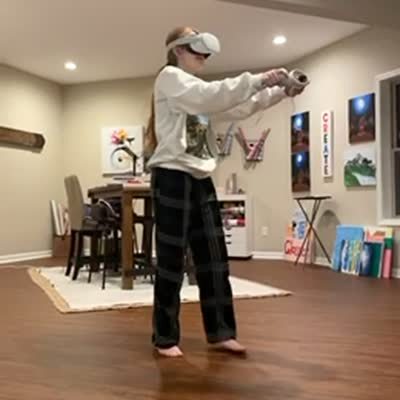 A mother plays a virtual reality video game while her son gives her instructions as he records her. She punches the camera lens by mistake, and he drops the camera.
