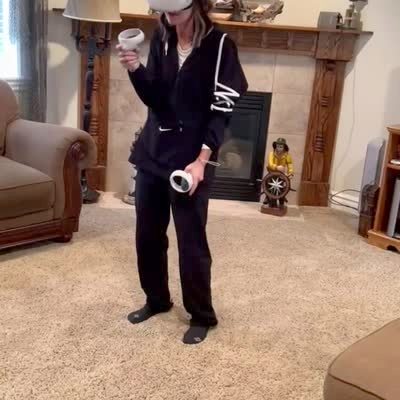 A woman plays a VR game and waves a game controller in front of her, then she punches her son as he walks by her in a living room.