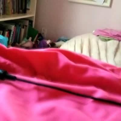 A woman falls backwards off a bed when something scares her in a virtual reality video.
