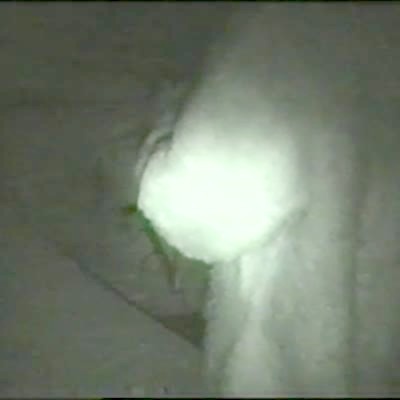A man recording in night vision zooms in on a large spider bug that builds a web on a porch, then the spider bug jumps at the camera, and the man falls off of the porch. First person POV.