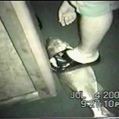 A man walks his dog then steps on a patio, and steps on a loose board he notices. His foot punctures through the wooden board and falls down. Security footage.