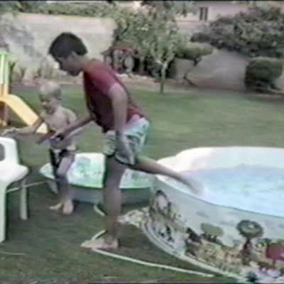 Toddler boy plays in a wading pool, he dives in. Grandpa gets in and falls on his butt. Mishap