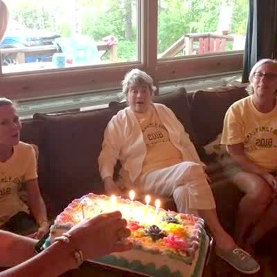 A woman curses in the living room when she drop a birthday cake on to a woman's lap as she goes to blow out the candles.