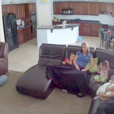 Home security camera footage of a woman who sits in the living room and then gets scared when part of the ceiling collapses and her husband's leg falls through.