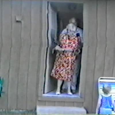 A mom holds a water squirt gun in a front yard and a dad sneaks up behind her and dumps a bucket of water on her and surprises her. Security footage.