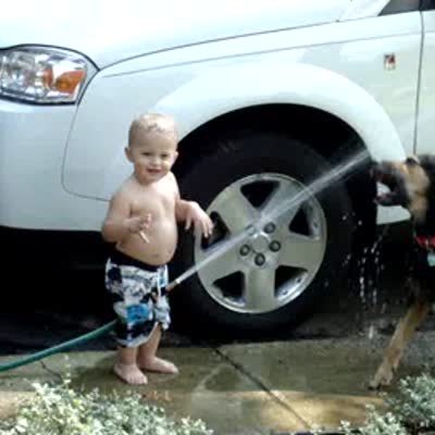 Tot girl waters the plants with a garden hose in the backyard, she points the hose at Dad who's filming. Dad gets upset & hides behind a tree.