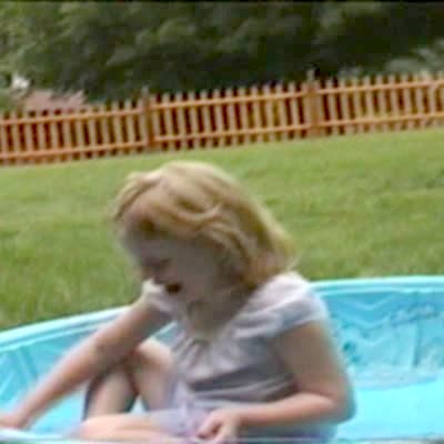 POOL DAD. Dad sits in toy pool spitting water from hose on boy, knocks him over.