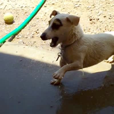 A clever dog turns on a water hose so it can bite the water that sprays out.
