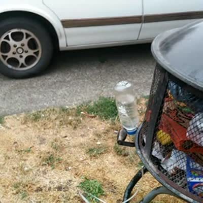 A bottle with water in it is pressurized and then flies through the air and it hits the camera.