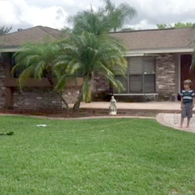 A boy launches a homemade water rocket in slow motion in the driveway and it bounces off the wall of the house and comes back to hit him in the head.