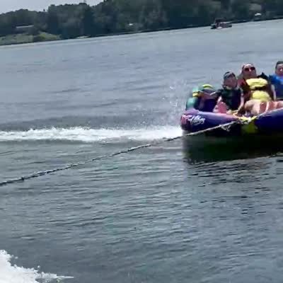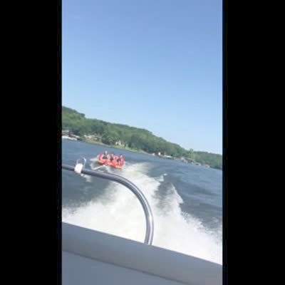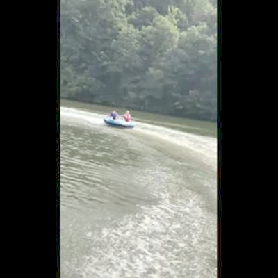 Three people fall off of an inner tube at a lake when a large wave flips it upside down as a motor boat pulls them across the water.