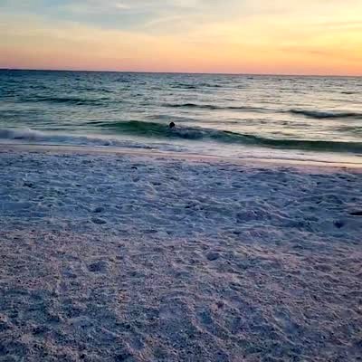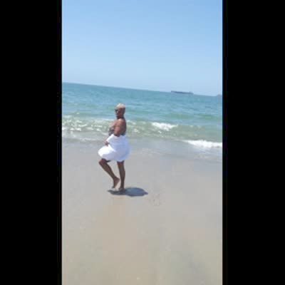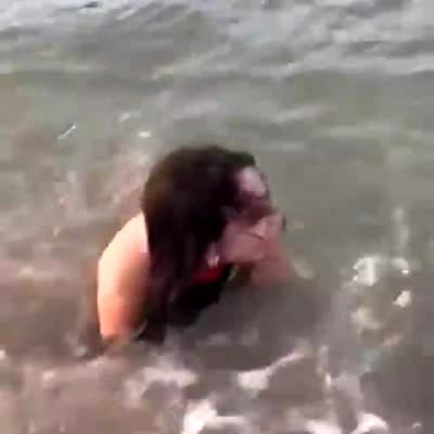 A woman dances outdoors at a beach in the surf, then falls over into the water.