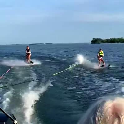Two young girls ride on an inflatable tube being towed ay high speeds behind a boat. The two girls are tossed from the raft with one of them being thrown high into the air before safely landing in the water.