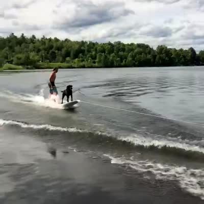 A man and a Labrador dog ride a surfboard while a boat pulls it through a lake.