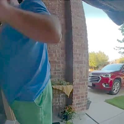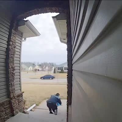 A teen boy on a front porch tries to ding dong ditch a house (where they ring the doorbell and then run away). When he tries to escape undetected, he slips and falls. Security Footage.