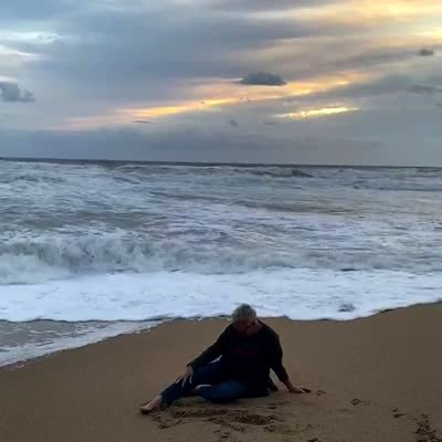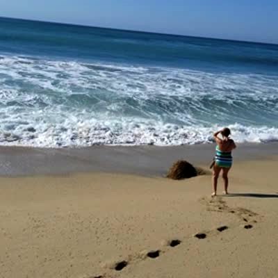 A woman poses for a picture in front of the ocean. A large wave hits the woman from behind and she falls down.