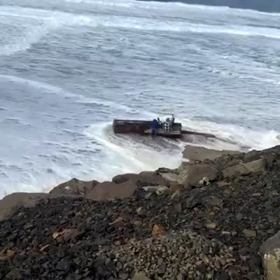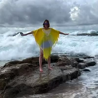 A woman sits on a rocky ledge to pose for a photo at the beach and a wave pushes her over. Featured talent cleared (woman on the rocks).