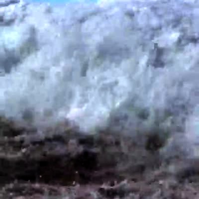 A woman stands on a rock when a wave crashes into her and knocks her over. Slow motion.
