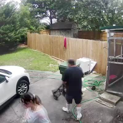 A man closes a dishwasher to move it onto a dolly in a backyard. Then he suddenly yells "bees, bees, bees!" and runs away, waving his hands. Security footage.