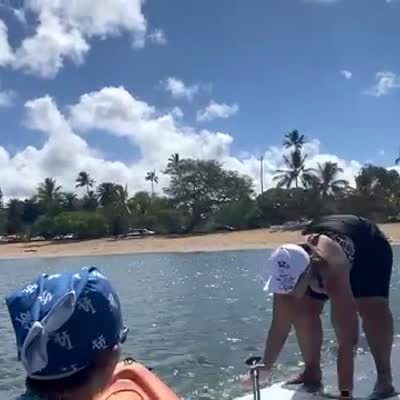 A woman paddle-boards for the first time and falls into the water while her family watches on. The man says "shit" when she falls. Featured talent cleared only (no releases for the people in the distance on the beach).