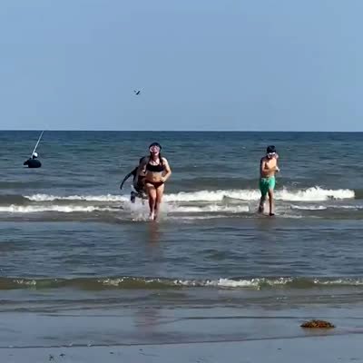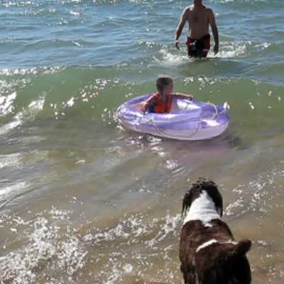A young girl and two young boys all fall when they run out of the ocean. Featured talent cleared only (the three children who fall in the water)