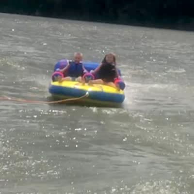 A young brother and sister fall off of an inflatable tube raft in to a lake after it hits a wave created by the motor boat pulling them behind it.