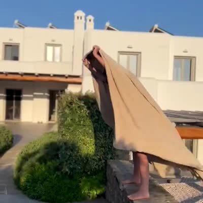 At a resort, woman waves a towel as the wind gusts and pushes her over a wall.
