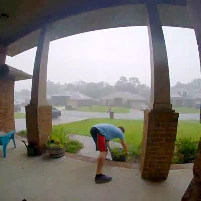 A man moves a planter then thunder strikes and he runs into the house as he flails his arms. Security footage.