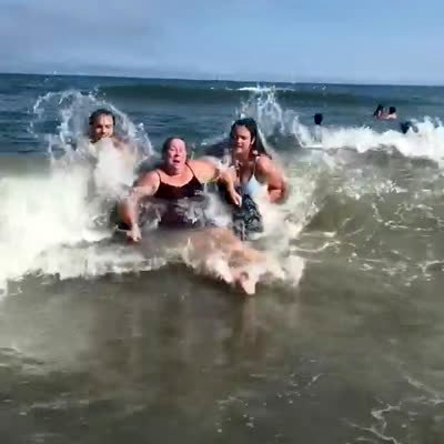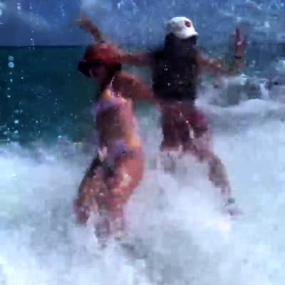 Two teen girls pose for a photo on the rocks at the beach. A wave then knocks over both of them.