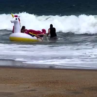 A man jumps onto a unicorn floaty in the ocean and a wave flips him over.