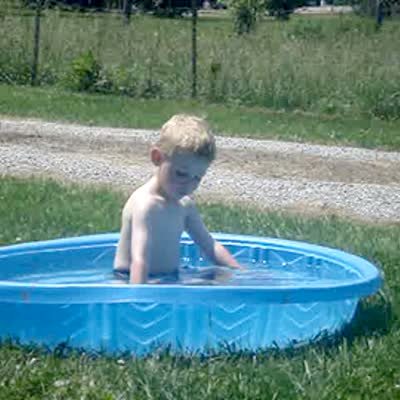 A young boy sits in a kiddie swimming pool with several fish. He picks the fish up, rubs them against his face, and shakes them. Weird, odd.