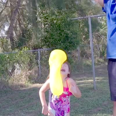 A man drops a water balloon on his young daughter's face in slow motion and it bounce off and onto the ground.