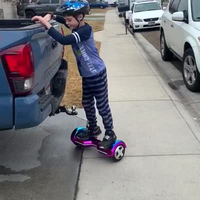 A young boy falls off a hoverboard on the sidewalk and another young boy rides a hoverboard into him and falls as well.