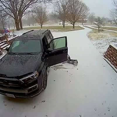 A woman gets out of her car and slips and falls in the winter snow, then a woman runs out to help her and she slips and falls as well. Home security footage.