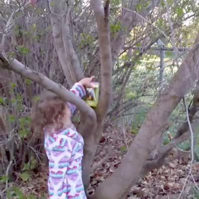 A tot girl repeatedly yells "where is it" in a yard while she looks for Easter chocolate that is right in front of her.