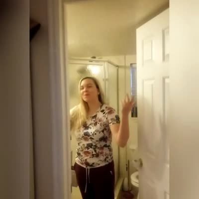 "Parental Police Prank" A senior woman is shocked as her daughter plays a prank where she calls to say she got pulled over. She tells her mom she has to pretend that she fell in the shower when the cop arrives at her home to verify. The woman sits in a bath towel and pretends she fell in a bathroom.