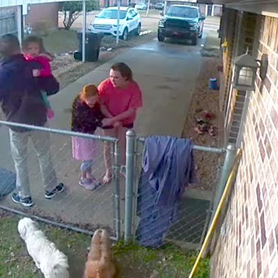 A man walks inside of a house. His two young daughters are left alone in a golf cart. The cart starts to go through a fence where three dogs are. Security footage.