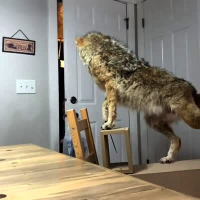 A young girl walks into a where a man has placed a taxidermy coyote which startles her as she walks into a kitchen and screams and covers her ears.